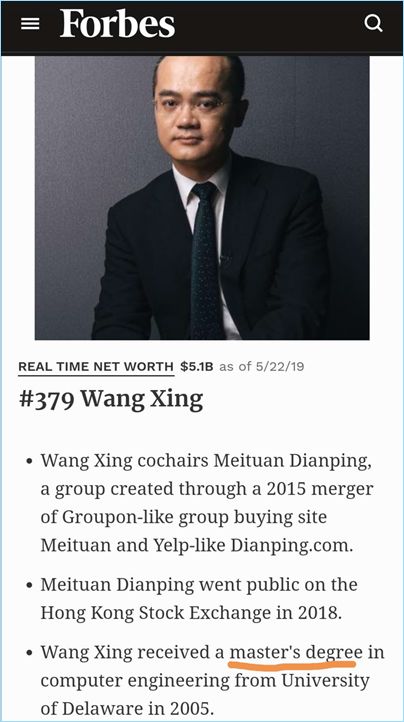 王興就和導(dǎo)師說,博士不念了,要回去創(chuàng)業(yè),于是拍屁股就走人了。后來,福布斯網(wǎng)站上的王興資料,寫的是特拉華大學(xué)碩士學(xué)位。